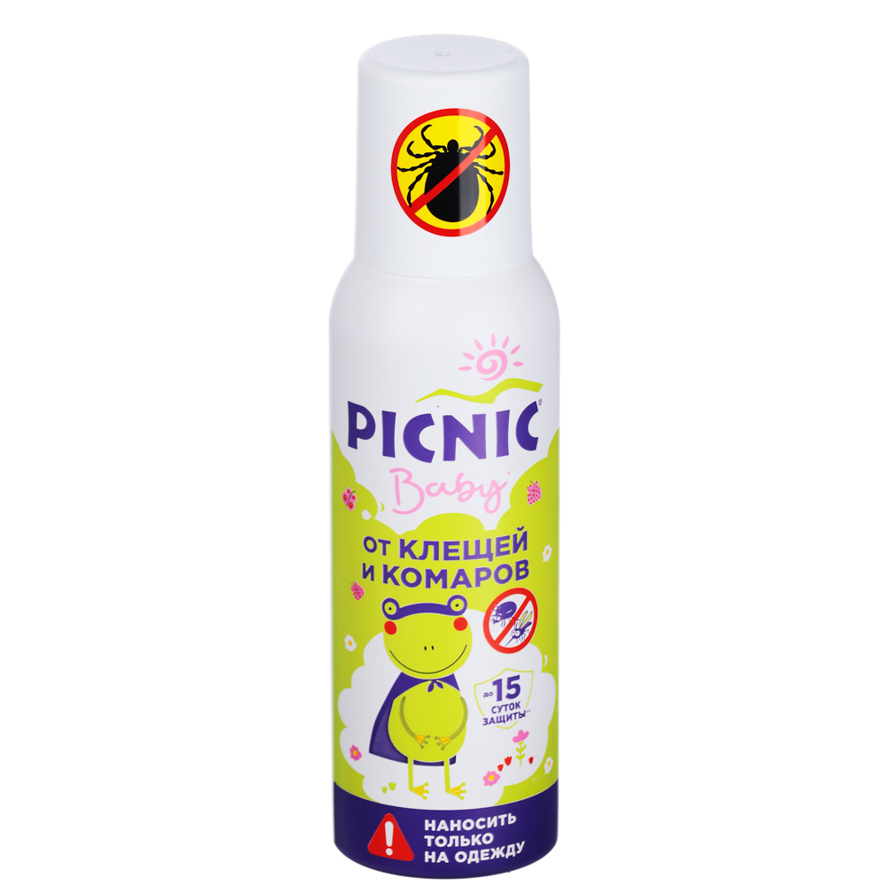 Аэрозоль от клещей и комаров детский Piknik baby помогает отпугнуть таежных и лесных клещей, блох, комаров, москитов, мокрецов от ребенка. Средство наносится только на детскую или взрослую одежду. Спрей от клещей Пикник наносится на одежду, не допускается наносить его на кожу. При обработке детской одежды особое внимание рекомендуется уделить местам возможного проникновения клещей под одежду: манжеты, горловины. рукава, носки, обувь. Обработать можно одежду, обувь и снаряжение: палатку и другие вещи, которые могут пригодиться ребенку или взрослому на отдыхе, на пикнике, в лесу, можно взять с собой на шашлыки, в поход, на отдых у реки. Обработанную одежду надевают поверх нательного белья, избегать соприкосновения с телом. С осторожностью обрабатывать вещи из синтетики и пластиковые элементы. После обработки защита от клещей сохраняется до 15 суток, комаров - до 10 суток или до первой стирки. Хранить обработанные вещи необходимо в полиэтиленовом мешке.