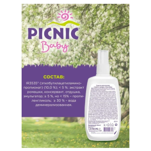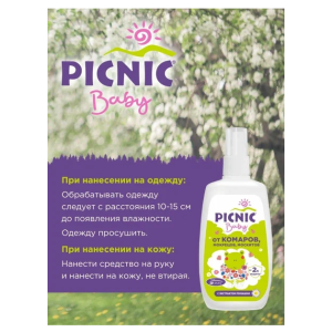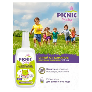 Спрей от комаров Picnic Baby предназначен для деликатной защиты нежной кожи детей от нападения кровососущих насекомых (комаров, москитов, мокрецов). В составе спрея для детей Picnic - самый безопасный репеллент IR 3535, который можно использовать для защиты от комаров детей от 1 года.
