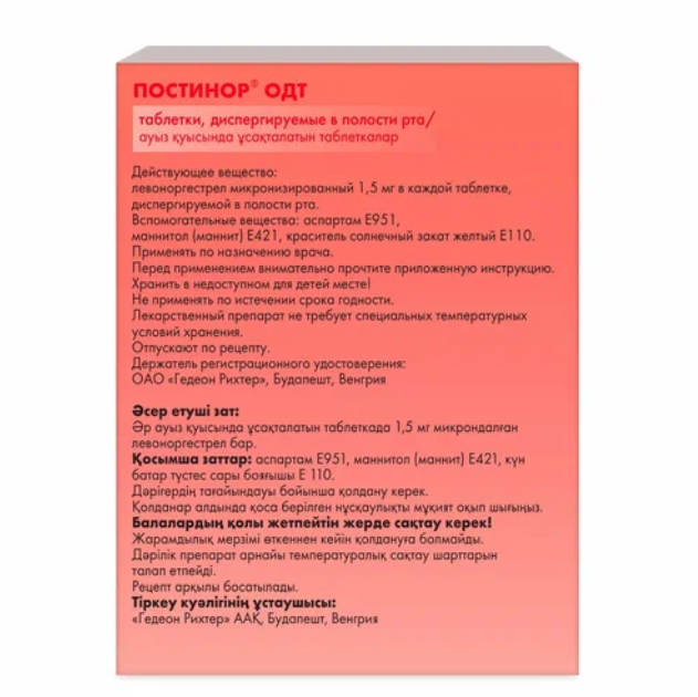 Применение препарата Постинор® ОДТ в возрасте до 18 лет противопоказано (в связи с наличием в составе препарата красителя солнечный закат желтый Е110).