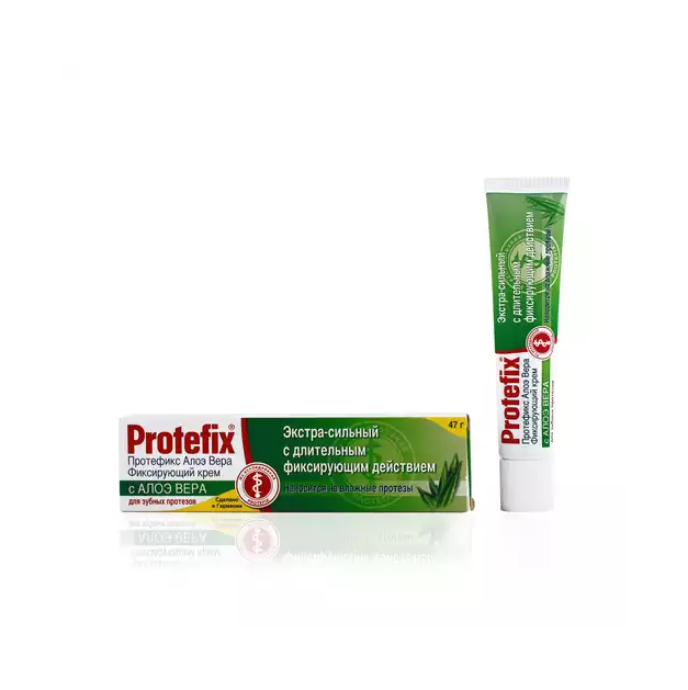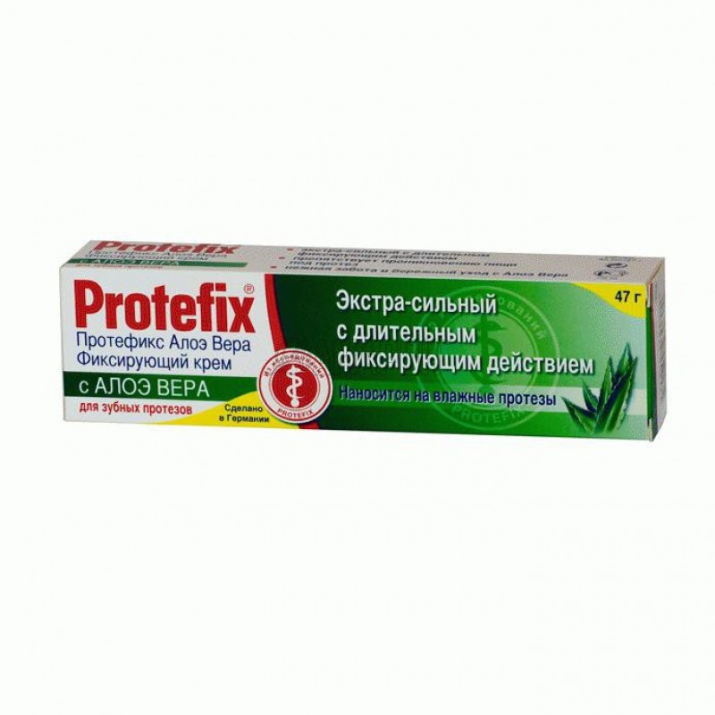 Фиксирующий крем Protefix (Протефикс) не содержит красителей и вкусовых добавок. Protefix Крем фиксирующий экстра-сильный для зубных протезов Протефикс Алоэ Вера - практически немедленно возникает сильная фиксация. Рекомендуется для надежной фиксации зубных протезов при повышенном и нормальном слюноотделении. Он легко наносится, сохраняет свои свойства под воздействием горячей и холодной пищи, не меняет вкус еды и напитков, не оказывает негативного воздействия на желудок. Не смывается слюной и равномерно распределяется по всей прилагающей к десне поверхности.