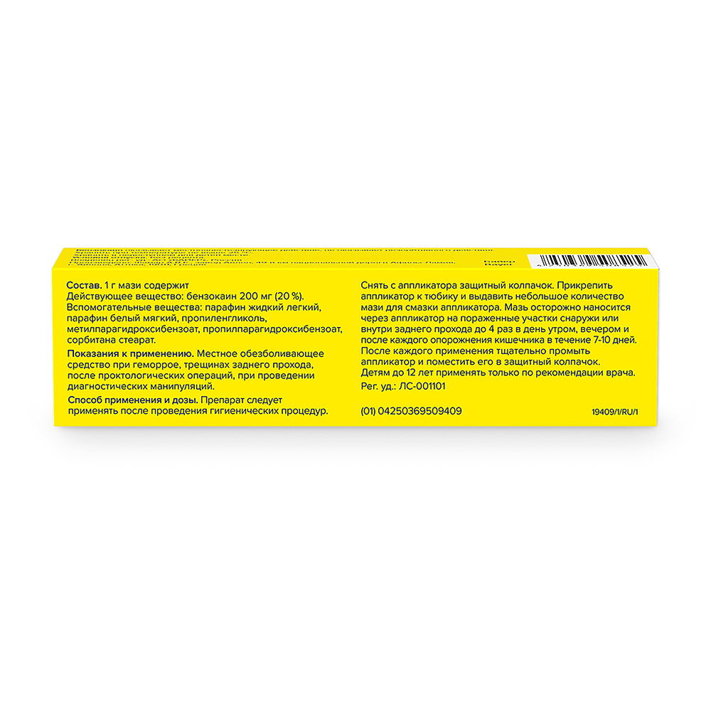 Местное обезболивающее средство при геморрое, трещинах заднего прохода, после проктологических операций, при проведении диагностических манипуляций.