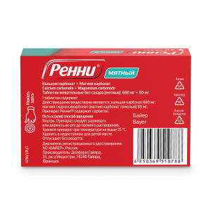 Быстрое достижение положительного эффекта обусловлено хорошей растворимостью таблеток и высоким содержанием кальция карбоната. Кальция карбонат обладает быстрым, длительным и сильным нейтрализующим действием. Данный эффект усиливается в присутствии магния карбоната, который также обладает сильным нейтрализующим действием. Исследования нейтрализации кислоты in vitro (модель искусственного желудка) показали, что препарат Ренни® увеличивает pH желудка с 1,5–2 до 3 за 40 секунд и может достичь значения pH 4 за 1 минуту 13 секунд. Максимальный достигнутый в испытании на модели уровень pH составил 5,24.
