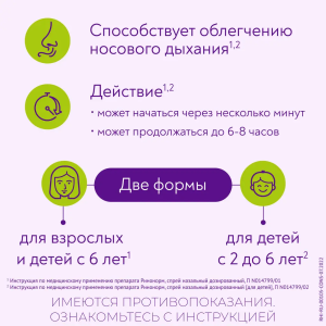 Отчетливое местное действие препарата выявляется уже через несколько минут и сохраняется в течение нескольких часов (до 6-8 часов), проявляясь в восстановлении проходимости носовых ходов, отверстий пазух и евстахиевых труб.