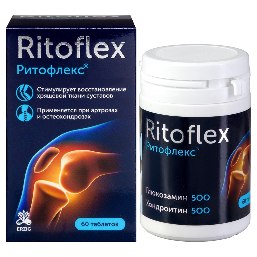 ГЛЮКОЗАМИН500+ХОНДРОИТИН500 РИТОФЛЕКС - Биологически активная добавка (БАД) к пище. Внешний вид и свойства: таблетки цилиндрической формы. Цвет от белого до серого, возможны вкрапления. Могут оставлять белый след на руках, т.к. не покрыты химической оболочкой. Содержит комплекс активных компонентов, необходимых для естественного восстановления хрящевой ткани при проблемах с суставами. Хондроитин и глюкозамин стимулируют регенерацию хрящевой ткани, а также предупреждают и замедляют процессы резорбции костной ткани.