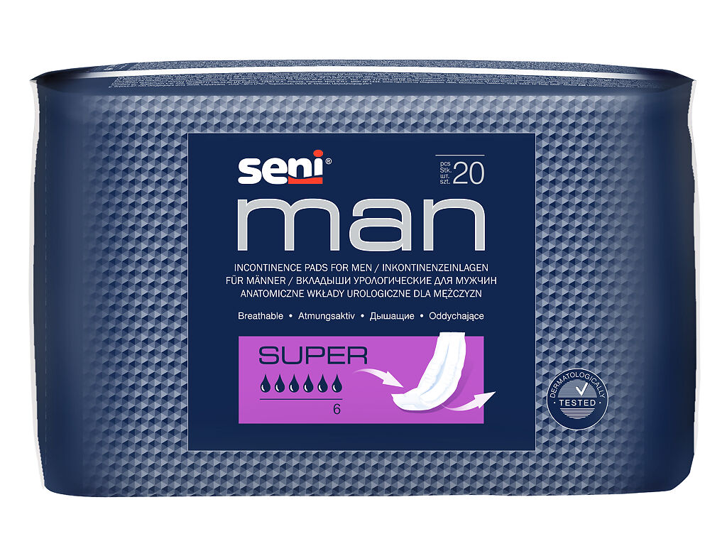 Урологические вкладыши Seni Man Super для мужчин, обеспечивают надежную защиту при средней степени недержания мочи (100-200 мл/4ч).