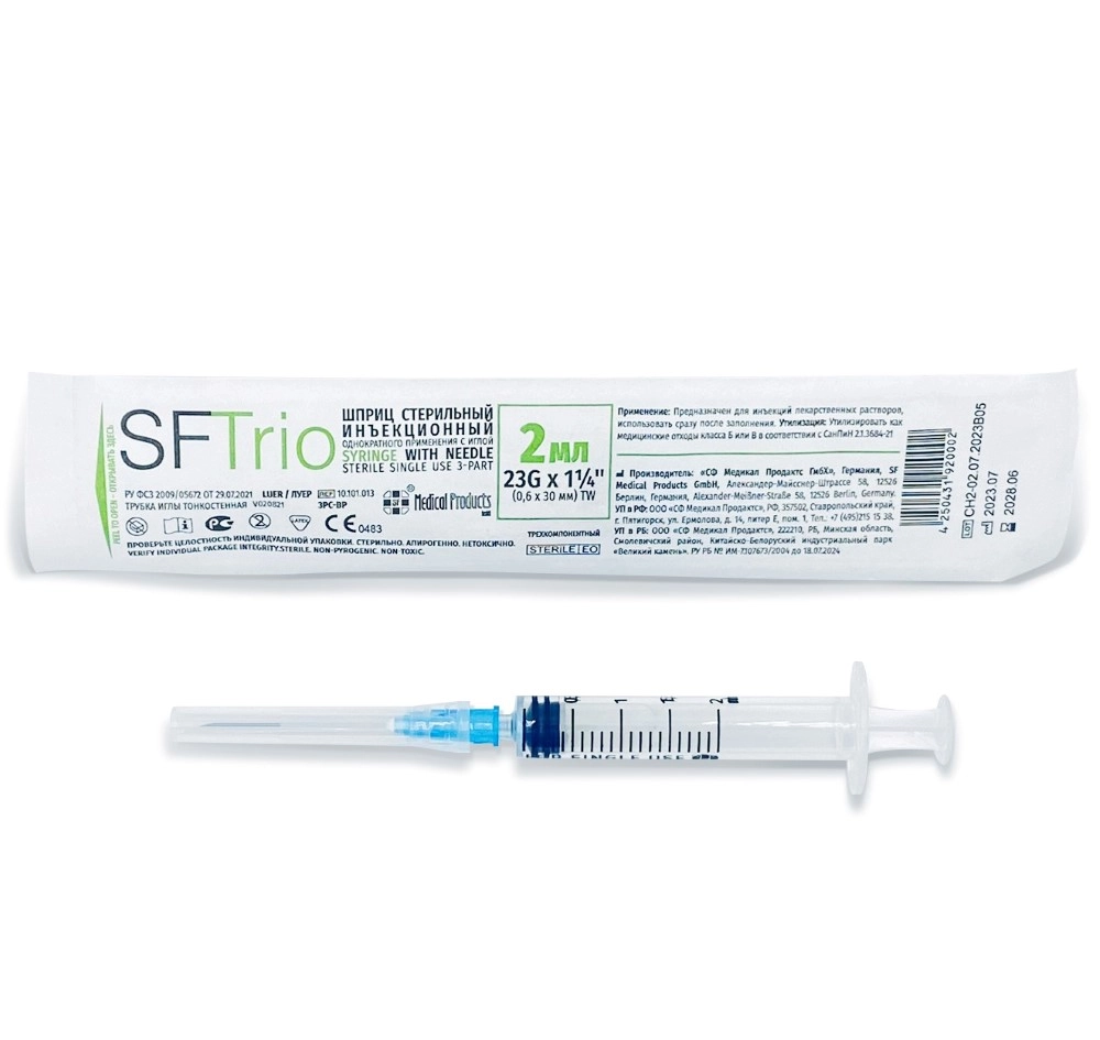 Шприц стерильный инъекционный однократного применения SF Medical Productc GmbH 2 мл с иглой 23G x 1 ¼" (0.6 x 30 мм). Шприц стерильный инъекционный однократного применения состоит из полого прозрачного цилиндра с нанесенной на него градуированной шкалой, наконечником (конусом) с отверстием и упорами для пальцев, штока-поршня с упором штока на нем и уплотнительным кольцом - манжетой (уплотнителем), надетой иглой инъекционной с защитным колпачком на ней. Соединение поршня с цилиндром и конусное соединение наконечника цилиндра с головкой инъекционной иглы водонепроницаемы, воздухонепроницаемы и герметичны под давлением. Шприц стерилизован оксидом этилена.