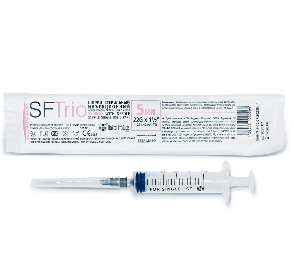 Шприц стерильный инъекционный однократного применения объемом 5мл с иглой 22G x 1 ½ (0.7 x 40 мм) SFTrio №1