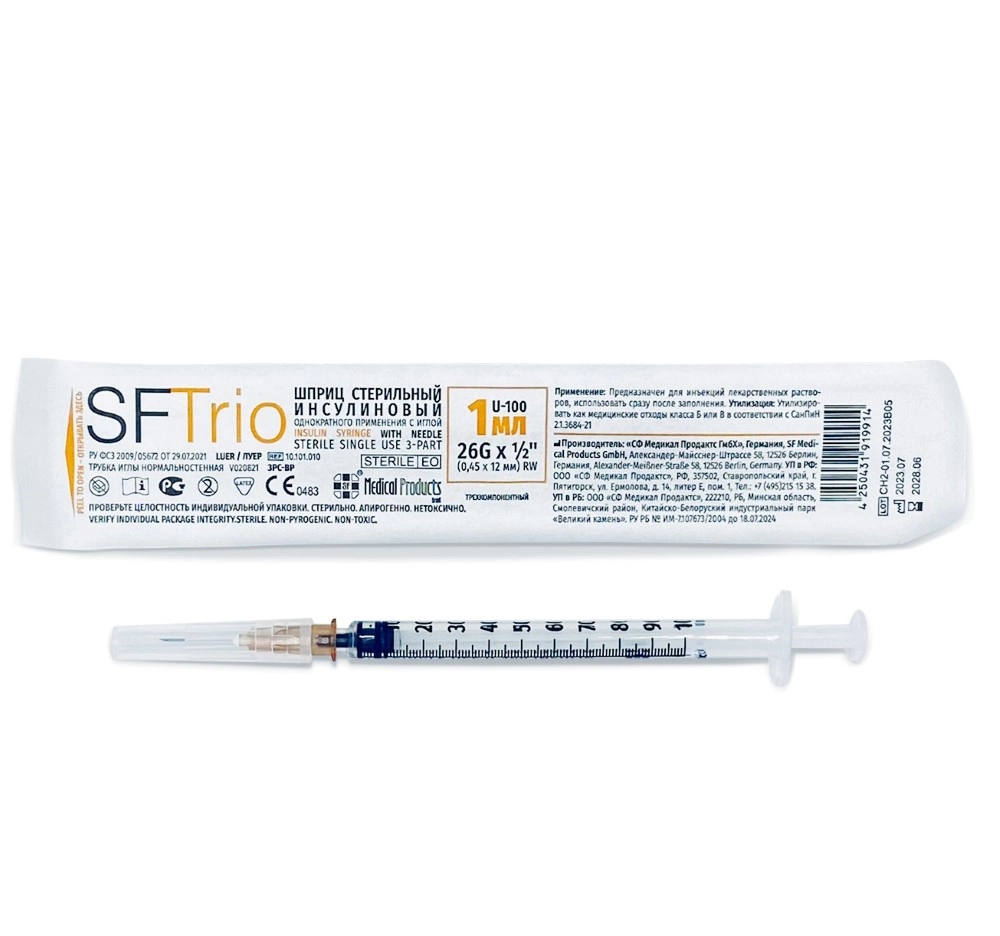 Шприц стерильныей инсулиновый, однократного применения объемом 1 мл с иглой 26G x ½" (0.45 x 12 мм).Производитель "СФ Медикал Продактс ГмбХ", Германия, SF Medical Products GmbH, Alexander-MeiBner-StraBe 58,12526 Berlin, Germany.