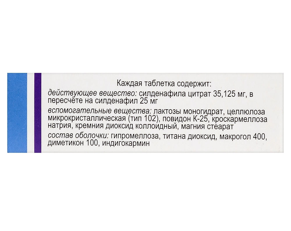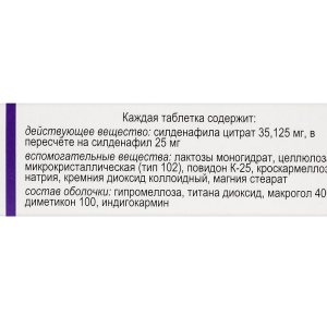 Каждая таблетка содержит 25 мг силденафила (в виде силденафила цитрата).