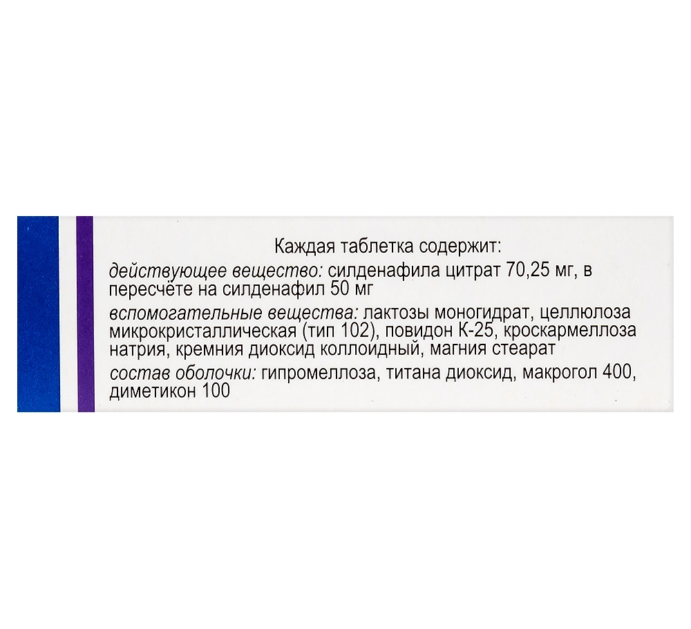 Каждая таблетка содержит 50 мг силденафила (в виде силденафила цитрата).