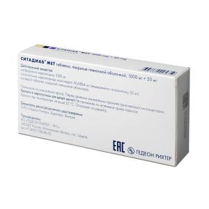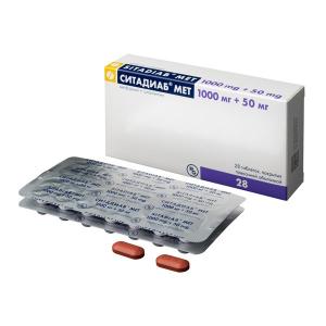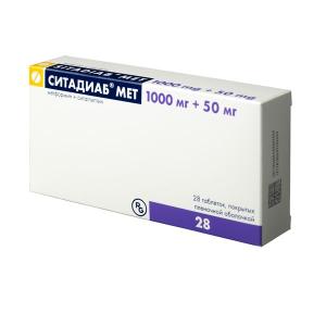 Препарат Ситадиаб® ;Мет, 1000 мг+50 мг, содержит действующие вещества: