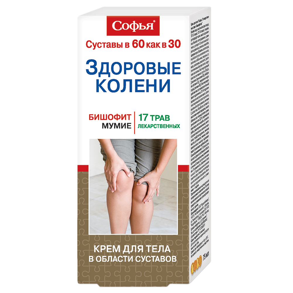 СОФЬЯ -17 лекарственных трав с бишофитом - специальный крем для тела в области коленей. Область применения:- при повышенных нагрузках наколенные суставы.-для профилактики при наличии факторов риска.- при малоподвижном образе жизни.- для профилактики сезонных обострений. Эффективность крема СОФЬЯ-17 лекарственных трав с бишофитом обеспечена высокой биологической активностью и синергизмом его натуральных компонентов, оказывающих глубокое комплексное действие в области коленей. Действие компонентов.
