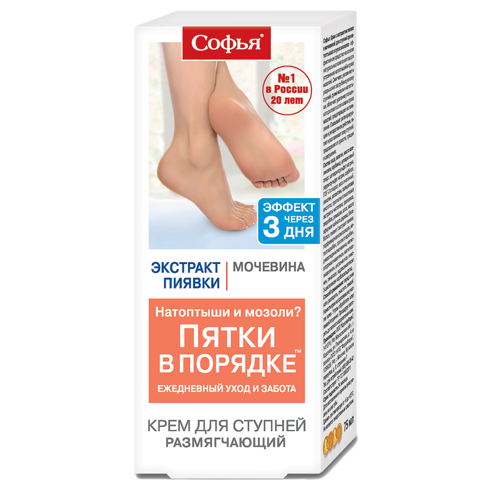 Софья крем с экстрактом пиявки и мочевиной, для ступней при натоптышах и сухих мозолях. Эффективное средство на основе натуральных компонентов для устранения натоптышей и сухих мозолей. Смягчает, увлажняет и разрыхляет загрубевшую кожу ступней, сухие мозоли и натоптыши, облегчает удаление утолщенного рогового слоя кожи и сухих мозолей, предотвращает их появление. Оказывает регенерирующее действие, питает и разглаживает кожу ступней, предохраняет от сухости, трещин и шелушения. Почему образуются сухие мозоли и натоптыши? Утолщение кожи на ступнях защитная реакция организма на давление и трение, возникающие во время ходьбы. При систематическом ношении обуви, не соответствующей размеру и строению стопы, или обуви на высоком каблуке возникают патологические утолщения рогового слоя кожи(омертвевших клеток эпителия) сухие мозоли и натоптыши, причиняющие дискомфорт и боль при ходьбе. Развитию сухих мозолей и натоптышей способствуют также избыточный вес, высокие физические нагрузки, возрастная сухость кожи и снижение ее эластичности.