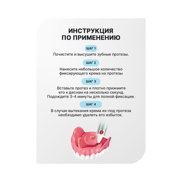 Зафиксируйте зубной протез в полости рта, плотно прижав его на несколько секунд. Подождите 3-4 минуты до полной фиксации.