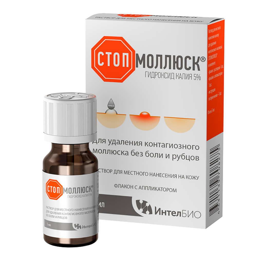 Раствор для удаления контагиозного моллюска СТОПМОЛЛЮСК предназначен для нанесения на поверхность кожных поражений, вызванных контагиозным моллюском. Раствор предназначен для самостоятельного применения в домашних условиях, используется только наружно. При использовании раствора размещайте флакон на плоской поверхности, чтобы избежать пролива. При применении раствора СТОПМОЛЛЮСК нет необходимости в местной анестезии.