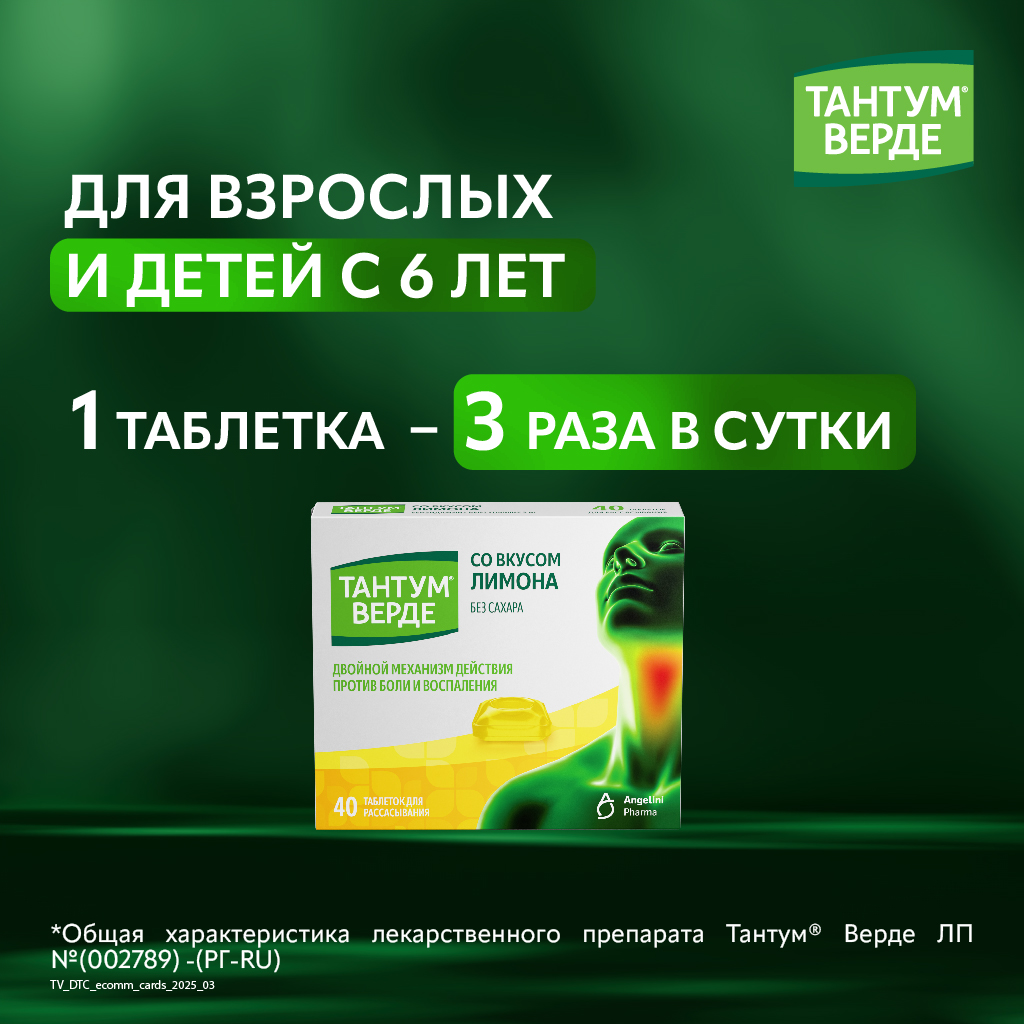 При применении препарата Тантум® Верде возможно развитие реакций гиперчувствительности. В этом случае рекомендуется прекратить лечение и проконсультироваться с врачом для назначения соответствующей терапии. У ограниченного числа пациентов присутствие язв в горле и полости рта может указывать на наличие более серьезной патологии. Если симптомы не проходят в течение более 3 дней, необходимо проконсультироваться с врачом. Применение препарата Тантум® Верде не рекомендуется у пациентов с повышенной чувствительностью к ацетилсалициловой кислоте или другим нестероидным противовоспалительным препаратам. Препарат Тантум® Верде должен с осторожностью применяться у пациентов с бронхиальной астмой в анамнезе по причине возможности развития у них бронхоспазма на фоне приема препарата. Препарат содержит изомальтозу и, в связи с этим, не рекомендуется у пациентов с наследственной непереносимостью фруктозы. Применение препарата у детей возможно только под наблюдением взрослых во избежание проглатывания таблетки.