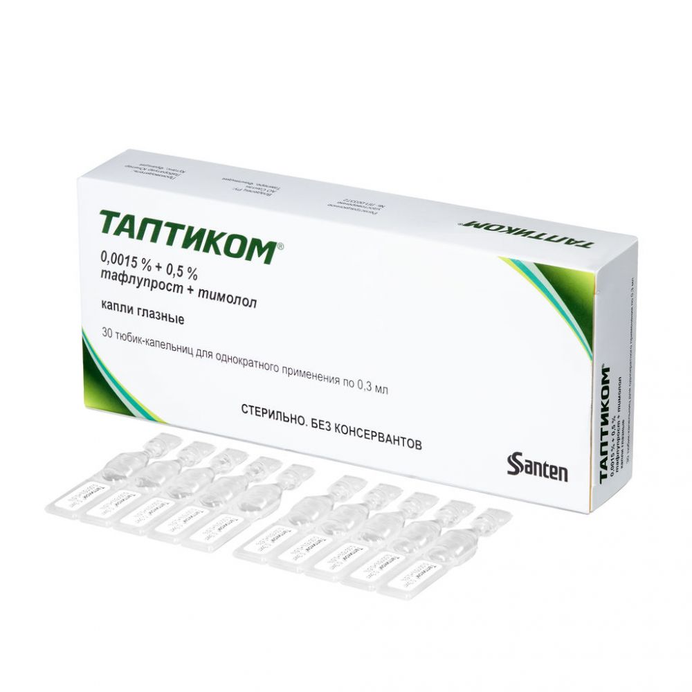 Таптиком® — лекарственный препарат, содержащий фиксированную комбинацию двух действующих веществ — тафлупроста и тимолола. Оба действующие вещества снижают внутриглазное давление (ВГД), взаимно усиливая действие друг друга, в результате чего эффект снижения ВГД при применении комбинированного препарата более выражен, чем эффект каждого из действующих веществ в отдельности.