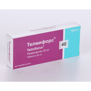 Телмифорс® (телмисартан) — специфический антагонист рецепторов ангиотензина II (АРА II) (типа AT1), эффективный при приёме внутрь. Обладает высоким сродством к подтипу AT1-рецепторов ангиотензина II, через которые реализуется действие ангиотензина II. Вытесняет ангиотензин II из связи с рецептором, не обладая действием агониста в отношении этого рецептора. Телмисартан связывается только с подтипом AT1-рецепторов ангиотензина II. Связь носит длительный характер. Не обладает сродством к другим рецепторам, в том числе к АТ2-рецептору и другим, менее изученным рецепторам ангиотензина. Функциональное значение этих рецепторов, а также эффект их возможной избыточной стимуляции ангиотензином II, концентрация которого увеличивается при назначении телмисартана, не изучены. Телмисартан снижает концентрацию альдостерона в крови, не ингибирует ренин в плазме крови и не блокирует ионные каналы. Телмисартан не ингибирует ангиотензинпревращающий фермент (кининаза II) (фермент, который также разрушает брадикинин). Поэтому усиление вызываемых брадикинином побочных эффектов не ожидается.