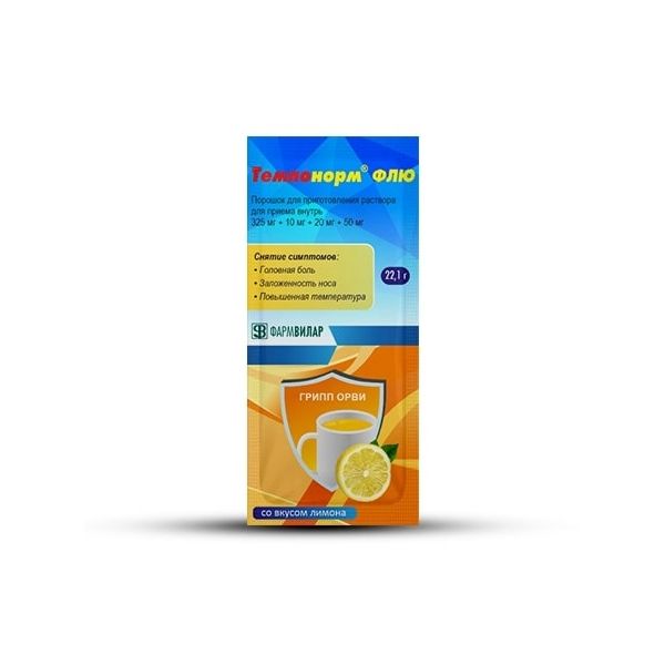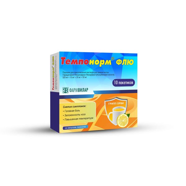 Темпонорм Флю порошок для приготовления раствора для приёма внутрь 325мг+10мг+20мг+50мг со вкусом лимона пакетики №10