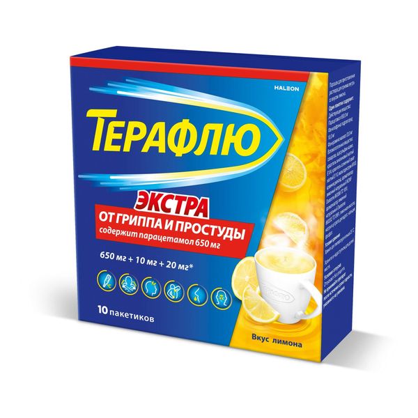 ТераФлю Экстра порошок для приготовления раствора для приема внутрь лимонный 650мг+10мг+20мг пакетики №10