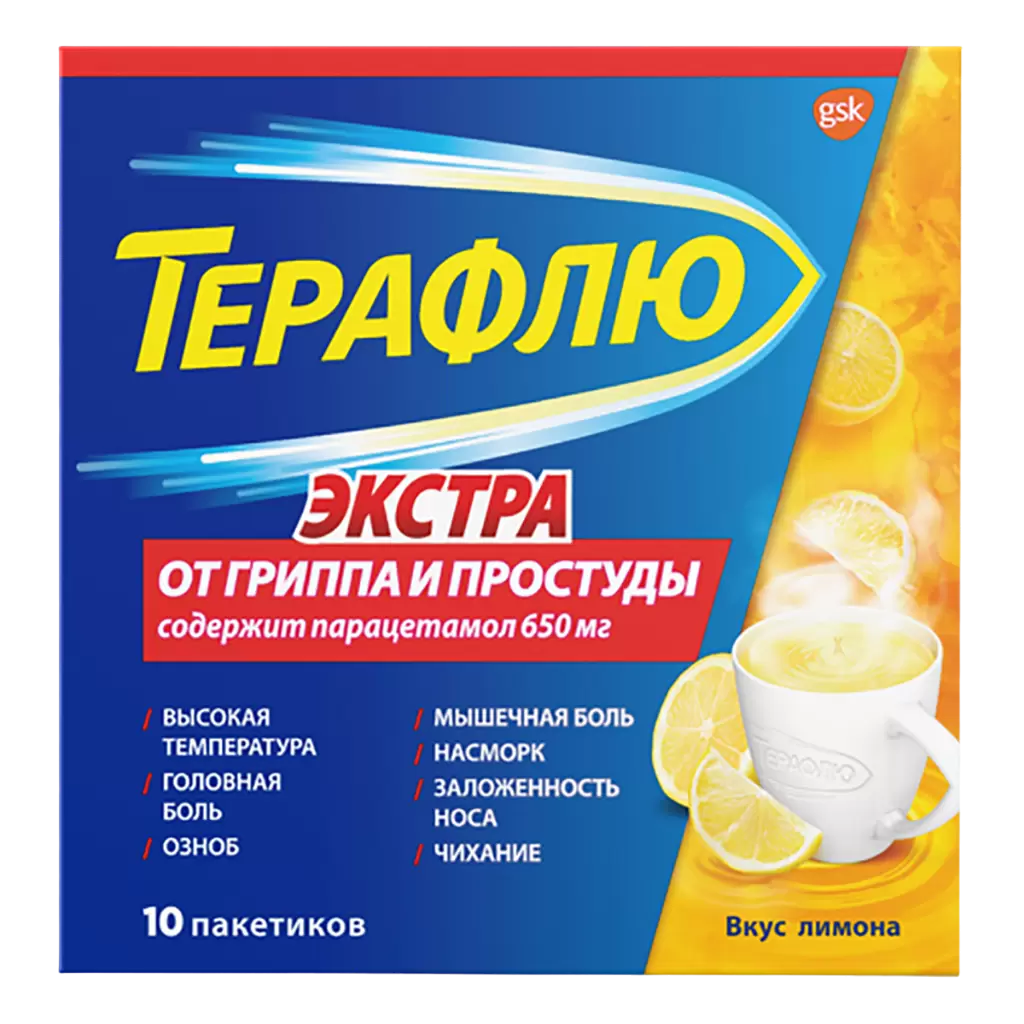 ТераФлю Экстра порошок для приготовления раствора для приема внутрь лимонный пакетики №10