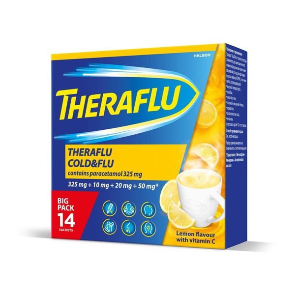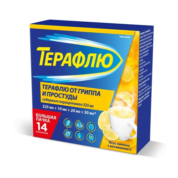 ТераФлю порошок для приготовления раствора для приема внутрь со вкусом лимона 325мг+10мг+20мг+50мг пакетики 22,1г №14