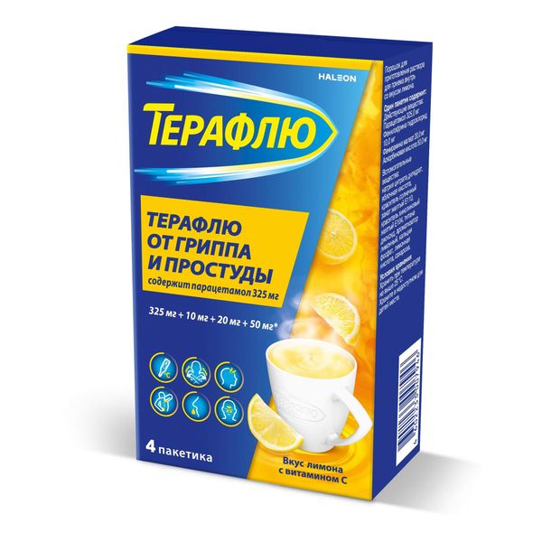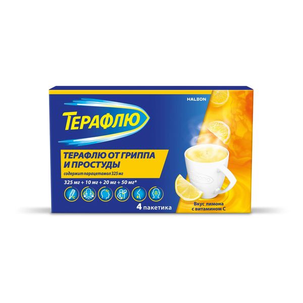 ТераФлю порошок для приготовления раствора для приема внутрь со вкусом лимона 325мг+10мг+20мг+50мг пакетики 22,1г №4