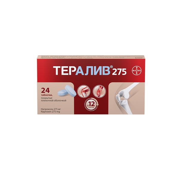 Препарат Тералив 275 представляет собой напроксен, обладает обезболивающим, жаропонижающим и противовоспалительным действием. Механизм действия связан с неселективным ингибированием активности циклооксигеназы-1 и -2 (ЦОГ-1, ЦОГ-2).