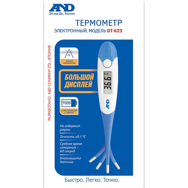 Электронный термометр (или градусник) AND DT-623 с гибким наконечником предназначен для измерения температуры тела человека тремя способами: орально, в подмышечной впадине (аксиллярно) или ректально. Время измерения около 60 сек.