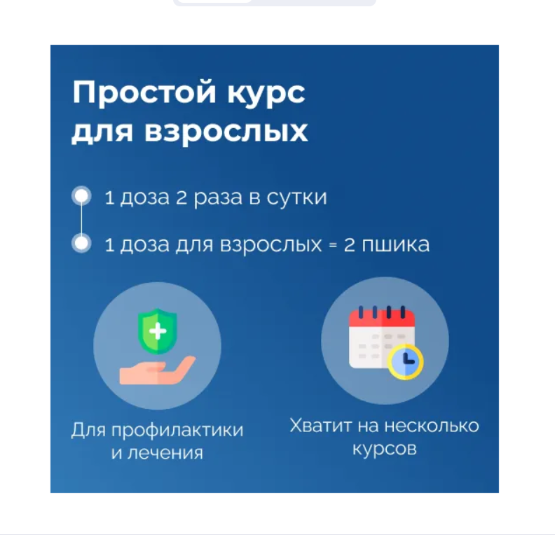 Взрослым: по 1 дозе (одно впрыскивание) в каждый носовой ход 2 раза в сутки в течение 10 дней с лечебной целью или в течение 3–5 дней с профилактической целью.