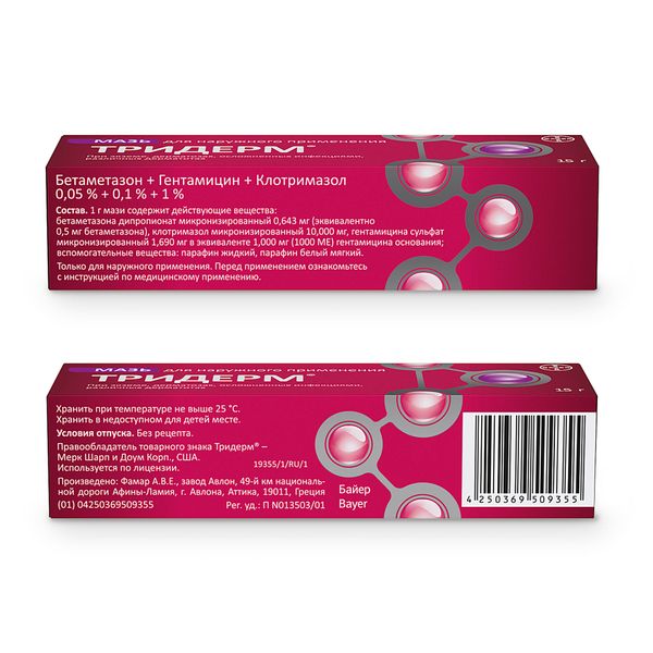 Активные вещества: бетаметазона дипропионат – 0,643 мг (эквивалентно 0,5 мг бетаметазона), клотримазол – 10,0 мг, гентамицина сульфат – в эквиваленте 1,0 мг (1000 МЕ) гентамицина основания