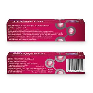 Крем Тридерм® сочетает в себе противовоспалительный, противозудный, противоаллергический и антиэкссудативный эффект бетаметазона дипропионата с противогрибковой активностью клотримазола и широким антибактериальным действием гентамицина сульфата.