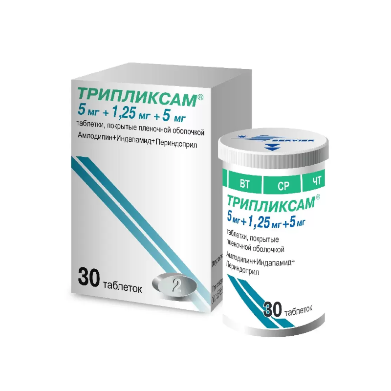 Трипликсам® - комбинированный препарат, включающий в себя три антигипертензивных компонента, каждый из которых дополняет действие других по контролю артериального давления у пациентов с артериальной гипертензией. Амлодипин — блокатор «медленных» кальциевых каналов (БМКК), производное дигидропиридина, индапамид — сульфонамидный диуретик, периндоприла аргинин — ингибитор фермента, превращающего ангиотензин I в ангиотензин II (ингибитор АПФ).