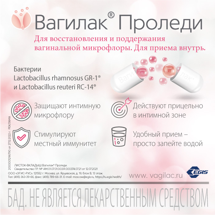 Капсулы для восстановления и поддержания вагинальной микрофлоры у женщин. Вагилак - источник пробиотических штаммов лактобацилл Lactobacillus rhamnosus GR- 1 и Lactobacillus reuteri RC-14 для женщин и девочек старше 10 лет.