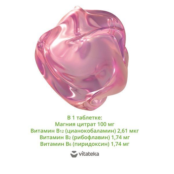 Магния цитрат носитель: микрокристаллическая целлюлоза носитель: мальтодекстрин носитель: гидроксипропилметилцеллюлоза антислёживающий агент: тальк краситель: диоксид титана носитель: пропиленгликоль антислёживающие агенты: диоксид кремния аморфный, магния стеарат рибофлавин, пиридоксина гидрохлорид, цианокобаламин.