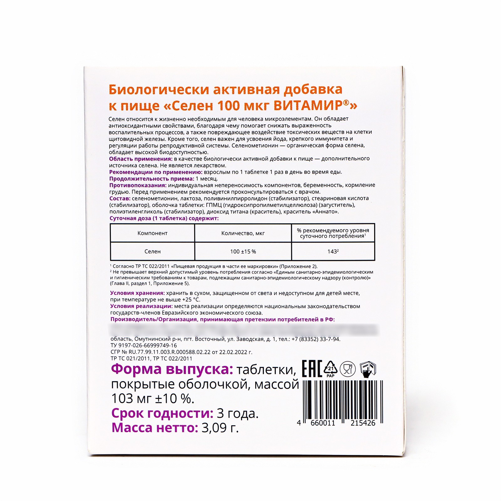 В суточной дозировке (1 таблетке) содержится: 100 мкг селена.