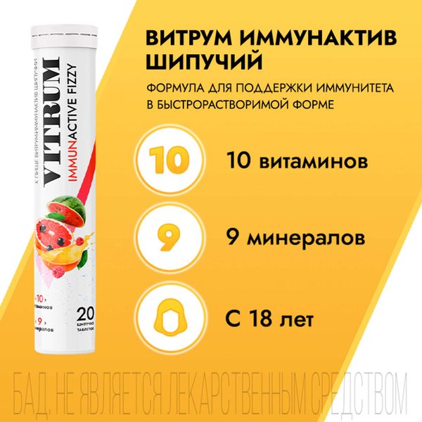 Витрум® Иммунактив Шипучий — новинка от Витрум®, комплекс витаминов и минералов для укрепления иммунитета в удобной форме растворимых шипучих таблеток. Формула содержит 10 витаминов и 9 минералов: повышенные дозировки витаминов группы В, С, РР, а также Цинк, Селен и Йод. Прием Витрум® Иммунактив обеспечивает поддержку иммунитета в период эпидемий гриппа и ОРВИ.