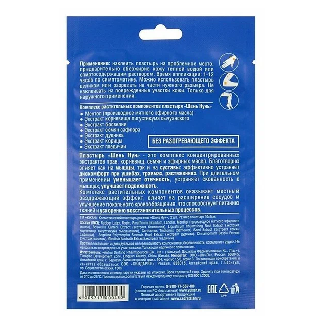 Пластырь "Шень Нун" объединил в себе богатейшие знания китайских мудрецов и стал современным аналогом травяных компрессов, которыми люди пользовались на протяжении тысячелетий для профилактики самых разных недугов. Это комплекс концентрированных экстрактов трав, корней, семян и эфирных масел. Благотворно влияет как на мышцы, так и на суставы: эффективно устраняет дискомфорт при ушибах, травмах, растяжениях. При длительном применении уменьшает отечность, устраняет скованность в мышцах, улучшает подвижность. Комплекс растительных компонентов оказывает местный раздражающий эффект, влияет на расширение сосудов и улучшение локального кровообращения, что способствует питанию тканей и ускорению восстановительных процессов. Эффект ощущается через несколько минут после наклеивания. Растительные вещества пластыря для тела быстро попадают в кровь и лимфу, минуя ЖКТ и печень. Лечебное действие на проекцию больной зоны, наступает значительно быстрее, чем от приема внутрь лекарственных форм. Не дайте шанса развиться заболеванию. Доверьте профилактику проверенному природному средству!