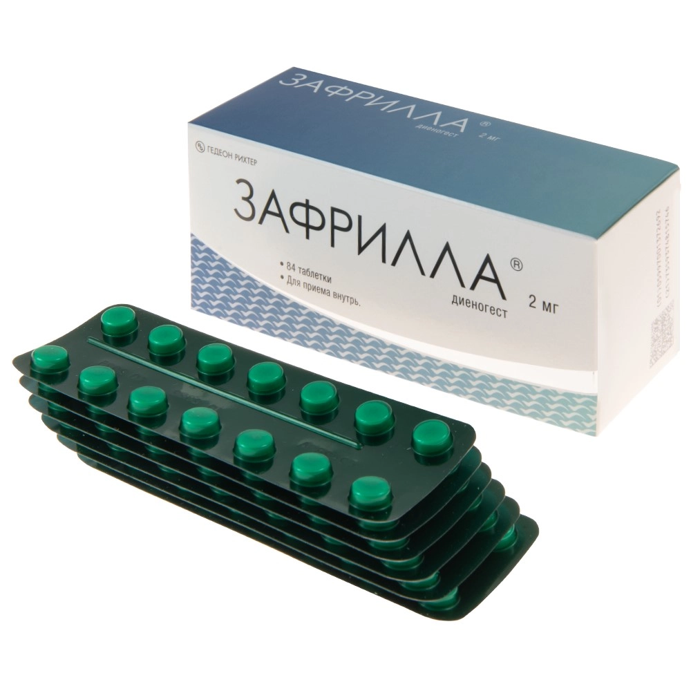 Нежелательные реакции (НР) чаще возникают в первые месяцы после начала терапии препаратом Зафрилла® и уменьшаются при продолжении лечения. Возможны изменения характера кровотечений, например, "мажущие" кровянистые выделения, нерегулярные кровотечения или аменорея. Самыми частыми НР, отмечаемыми при лечении диеногестом, являются головная боль, дискомфорт в молочных железах, депрессивное настроения и акне. Кроме того, у большинства пациенток, получающих диеногест, изменяется характер менструальных кровотечений. В течение первых 90 дней терапии диеногестом наблюдались следующие виды нарушений менструального цикла: аменорея, нечастые кровотечения, частые кровотечения, нерегулярные кровотечения, длительные кровотечения.