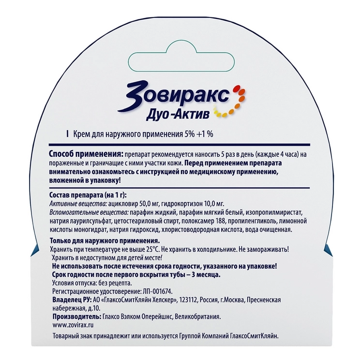 Гидрокортизон относится к слабоактивным глюкокортикостероидам. При наружном и местном применении терапевтическая активность гидрокортизона обусловлена противовоспалительным, противозудным, противоаллергическим и антиэкссудативным (благодаря вазоконстрикторному эффекту) действием. В результате комбинации противовирусного действия, оказываемого ацикловиром, и противоспалительного действия, оказываемого гидрокортизоном, препарат Зовиракс® Дуо-Актив предупреждает образование элементов везикулярной сыпи на поражённых участках кожи (при применении в продромальный период), а также сокращает сроки заживления уже образовавшихся элементов сыпи. Механизм действия обусловлен блокированием репликации вируса и торможением развития воспалительной реакции на поражённом участке кожи, что приводит к уменьшению выраженности симптомов инфекции.