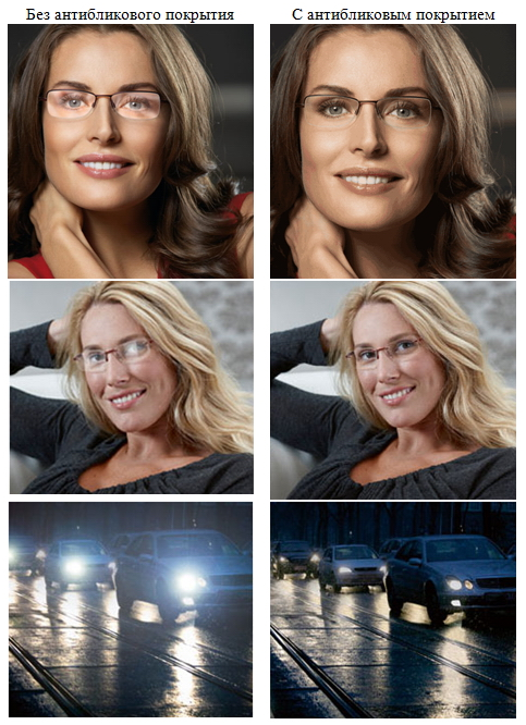 Для устранения бликов и ложных изображений на поверхность линз наносятся просветляющие покрытия, состоящие из одного или нескольких просветляющих слоев. Они обеспечивают повышенный зрительный комфорт и более высокую остроту зрения. Линзы с просветляющим покрытием обладают эстетическими качествами: позволяют окружающим людям ясно видеть глаза человека в очках, а кроме того, на таких линзах отсутствуют посторонние блики при фотосъемке.